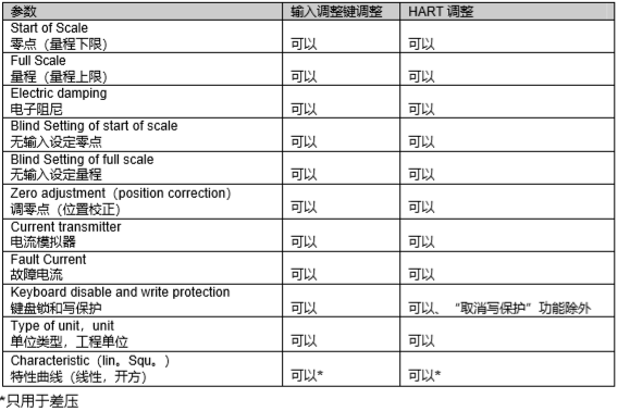 西門子壓力變送器參數的調整可以在現場通過儀表自身配備的三個輸入調整鍵實現,也可以通過HART 協議外部實現。以下表中列出的為上述可實現的基本參數。其它用于特別用途的參數可以通過 HART 協議調整。